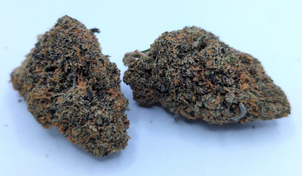Carbon Fiber is an evenly balanced hybrid strain (50% indica/50% sativa) created through crossing the potent (Cookies & Cream X Grape Pie) X Biscotti strains. The perfect well-balanced hybrid strain, Carbon Fiber packs a punch of potency and effects that hit both mind and body. You’ll feel the high hit you almost immediately, smashing into your brain with a high-flying euphoria that has you giggly and sociable, chatting and laughing with anyone and everyone around you about anything at all. At the same time, a sense of physical calm will wash over you, lulling your body into a state of pure relaxation and ease. Carbon Fiber is often chosen to treat those suffering from conditions such as chronic stress or anxiety, depression, PTSD, mood swings and Bipolar Disorder. This bud has a sweet and fruity berry grape flavour with hints of spicy black pepper upon exhale. The aroma is very similar, with a spicy black pepper overtone accented by earthy herbs and fruity dank grapes. Carbon Fiber buds have fluffy rounded dark olive green nugs with thin, long red-orange hairs and a coating of tiny, milky white crystal trichomes.